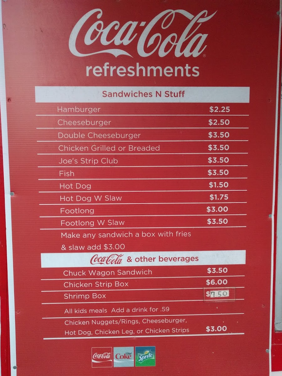 As a reviewer looking back at the menu of Joe’s Drive Inn & Chicken, it’s clear that this restaurant stays true to the spirit of classic American comfort food with a simple yet satisfying selection. The beverage lineup is familiar and refreshing, featuring options like the Lg Coca-Cola Fountain Drink, Md Coca-Cola Fountain Drink, Sm Coca-Cola Fountain Drink, Gold Peak Tea, Milkshake, and Milk, which pair perfectly with any meal. Moving on to the food, the “Sandwiches N Stuff” section highlights the heart of the menu, where timeless favorites such as the Hamburger, Cheeseburger, and Double Cheeseburger deliver exactly what you’d expect from a traditional drive-in. For those craving chicken, the choices of Chicken Grilled Or Breaded and the uniquely named Joe’s Strip Club add variety and personality to the menu. Overall, the menu at Joe’s Drive Inn & Chicken may not be extensive, but it feels thoughtfully put together, focusing on familiar flavors, straightforward options, and comfort-food appeal-making it a fitting conclusion to the dining experience this local spot aims to provide.